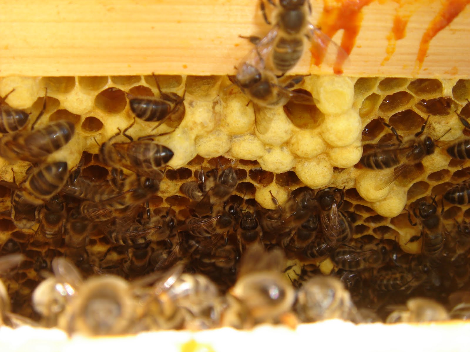 Checked the hive today and great to see numbers growing again. They completely finished the Apifonda I gave them last week and hopefully are now building their stores themselves. I have added another super to the hive too, to make sure they have enough room to develop their stores even further. As this picture shows, there are brood cells (the ones with the convex, spherical tops) being hatched too. Haven't spotted the Queen, but I know she is there as she is laying so well. Trying to keep the grass down around the two hives, whilst not annoying the bees, can be tricky. They don't like the noise or the heat of the mower, so it's a good idea to get in and out quickly, so they don't have time to get too agitated.