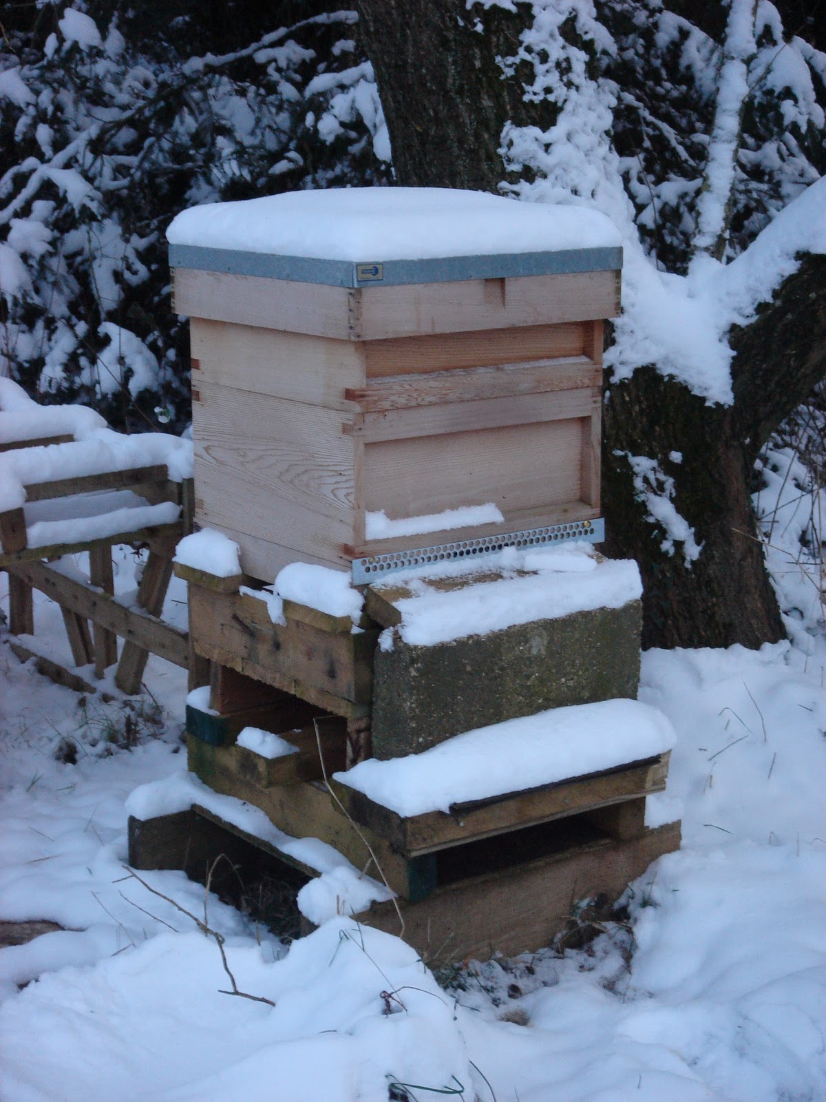 It's been a long time since I posted as it's been really busy with the pigs, the chickens, the garden, then the cold set in and I almost completely stopped checking on the bees as it would have disturbed them too much during the freezing temperatures. I made sure they had some feed before the cold set in, on top of the honey stores they had made for themselves. We had a slightly warmer day at the start of January and some of the bees were coming out, doing some housework, bringing out some of the dead bees, good normal stuff; then I noticed there was nothing from the larger colony (Alpha). I decided to check on them and sure enough, they were all dead. The varroa seemed low, there were stores and extra feed available which I had given them, the frames didn't smell like it was foul brood; it just seems that they didn't manage to keep themselves alive over the very cold nights through the end of 2010 (it got down to -12c at least on a couple of occasions). But attending the New Forest and District Bee Keepers Association today gave me a chance to talk to some of the other local bee keepers about it and encouraged me that this happens and if they had feed and the hive was in good condition and they were disease free/very low, then I did what I could. I am just pleased the other colony (Delta) is doing well and although it was a good deal smaller than the colony I lost, it should build well when the Spring kicks in. It's good to see the Bee Keeping Association folk on a regular basis to check your thinking on these things and get some encouragement when things go a bit awry.