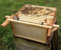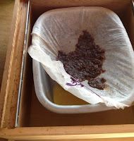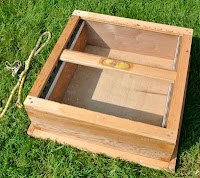 The Solar Extractor - Nothing new here, lots of beekeepers have these to help extract unwanted wax from frames, and then separate that dirty wax into clean wax and other stuff. However, I wanted to work out how to make one from stuff I already have, rather than spend hundreds on a purpose built box. As you can probably already work out, I took a hive box (brood or super) and a glass crownboard that I already owned; then I cut a piece of hardboard so it would fit underneath the box with an extra inch all the way around. I nailed batten wood all around that extra width on the hardboard, so that the box could be dropped onto the hardboard and fit snugly. Then it is all held together with a bungy cord to keep it tightly in place.