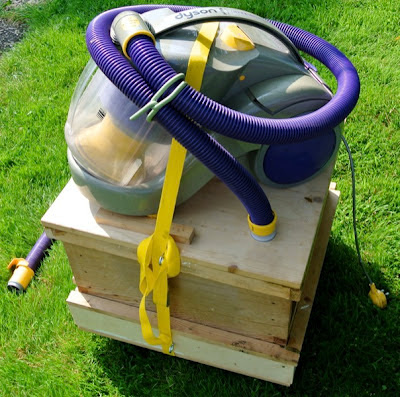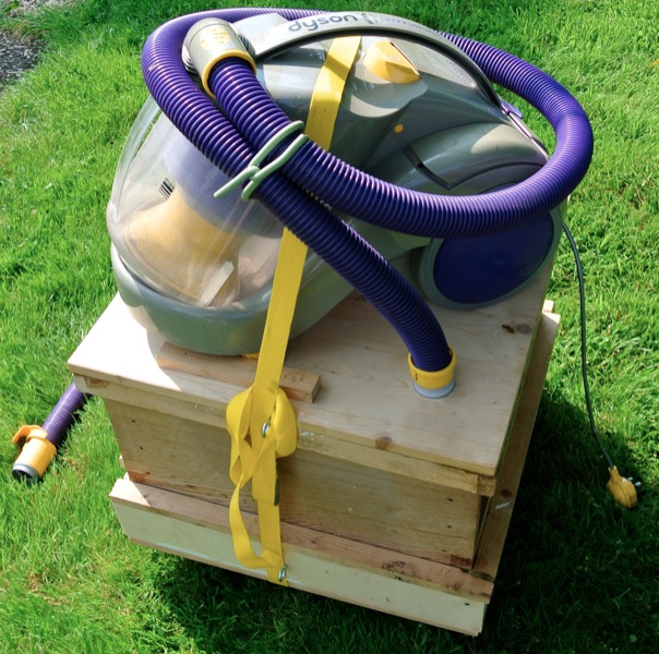 This allows me to control the strength of the vacuum in the box; you should use as little power as possible so that it is enough to pull in the bees, but not so much you end up with casualties. The batten on the top and the block behind them are fitted to hold the Dyson DC02 in place, as it has wheels front and back that would soon have it rolling off the top if it was not held in place with these. Once on top, the vacuum hose fits into the other hole and this is where the suction begins. The whole lot is held together with a long yellow strap which is shown in the picture below. Yes - it is heavy, but the idea is that I bring it onto swarm-site in pieces and put it together when I need it. It takes less than two minutes to put it together. The retractable powercord on the Dyson helps keep things tidy, but I use a extension cord too, as although swarms are often in peoples gardens, you will need to get power to the DC02 as the swarm is seldom right next to the house.