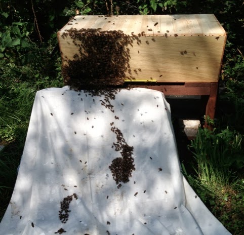 I picked up a swarm not too long after and introduced them to the hive using a sheet leading up to the entrance. It worked really well.